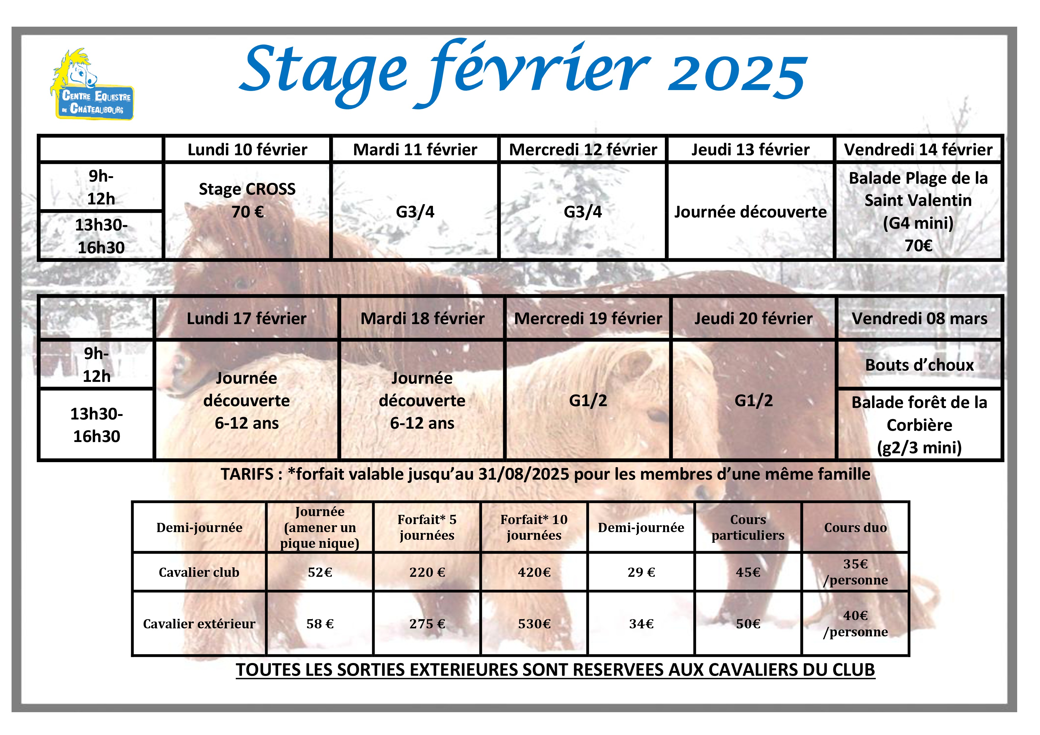 Image Partagez sur : LES DERNIÈRES ACTUALITÉS CENTRE ÉQUESTRE de CHÂTEAUBOURG 09 jan 2026 Image Ouverture des inscriptions pour les stages de février 2026 22 déc 2023 Image LE planning des concours 2024 est en ligne 10 nov 2023 Image Equifun de Noêl